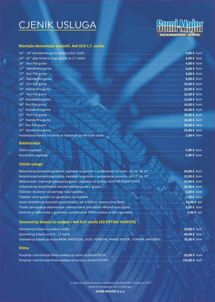 Cjenik Vulkanizerskih Usluga - Gumi Major